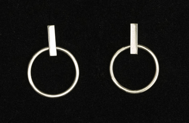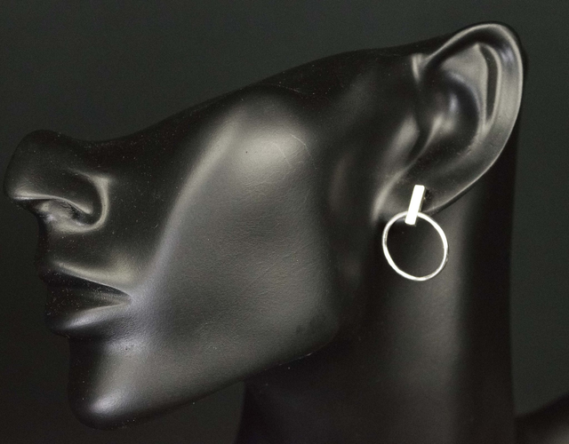 A pair of Sterling silver dangly hooped ear studs with a fine satin finish. Contemporary, minimalist, sleek!