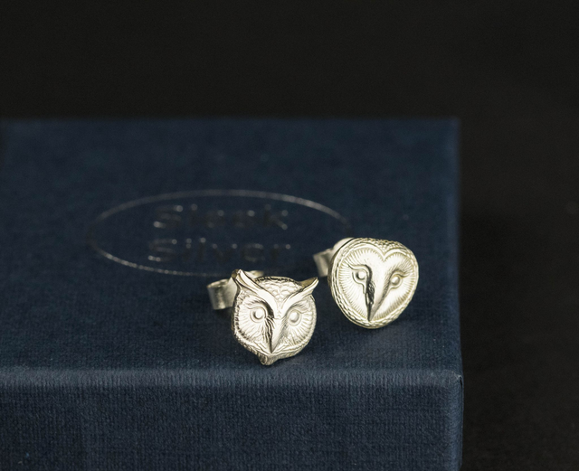 A pair of Sterling Silver ear studs featuring the faces of two owls, a barn owl and a long eared owl. Contemporary, minimalist, sleek!